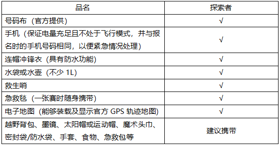1、选手行进过程中如被发现未携带要求的参赛装备,将被取消比赛资格或比赛成绩。
